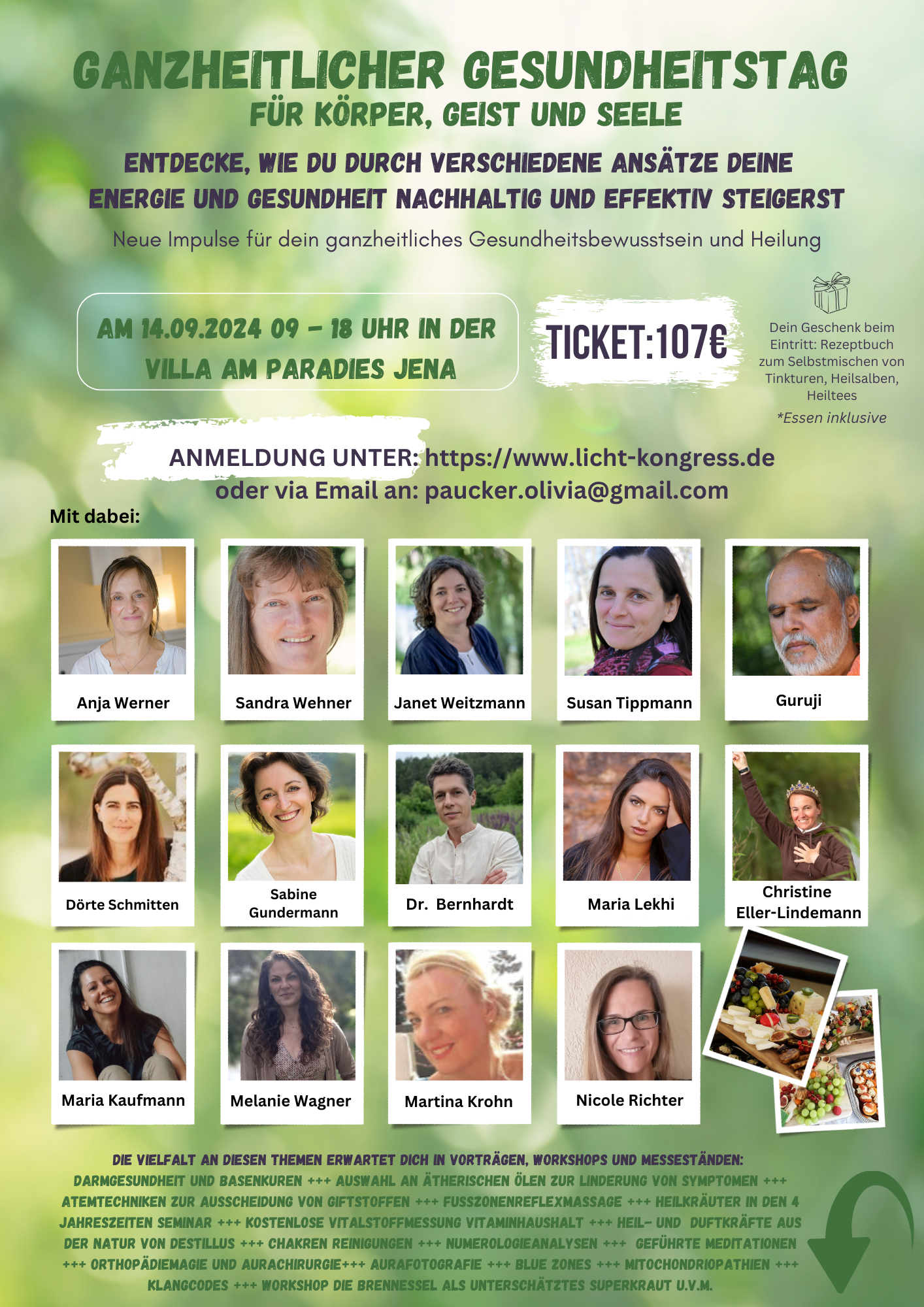 - Zugang zu verschiedenen Kursräumen wie in einer Messe nur mit vielen praktischen und angeleitetenen Übungen: Energetischen Checks und Energetischen Behandlungen, Kakaozeremonie, Chakren Reinigungen, Numerologische Kurzanalysen, Aurafotografie, Live Destillation, Kräuterkunde und Kräuterseminare, Darmreinigung Seminare, bewussten Atemtechniken, geführten Meditationen und vielem mehr!